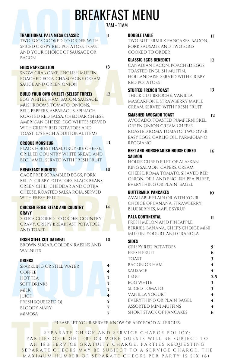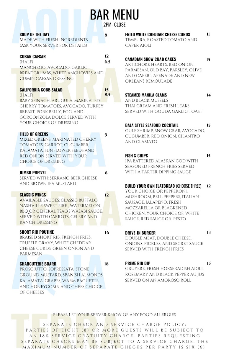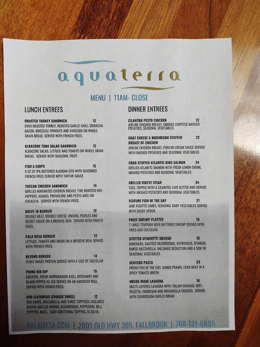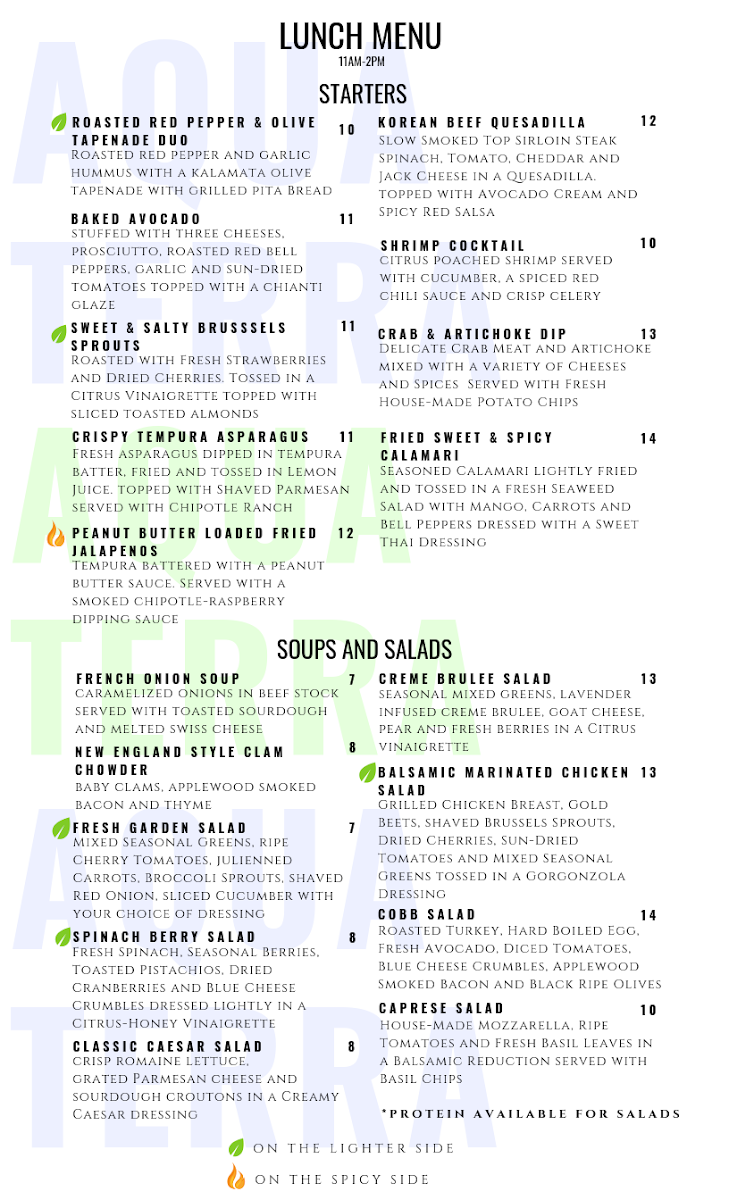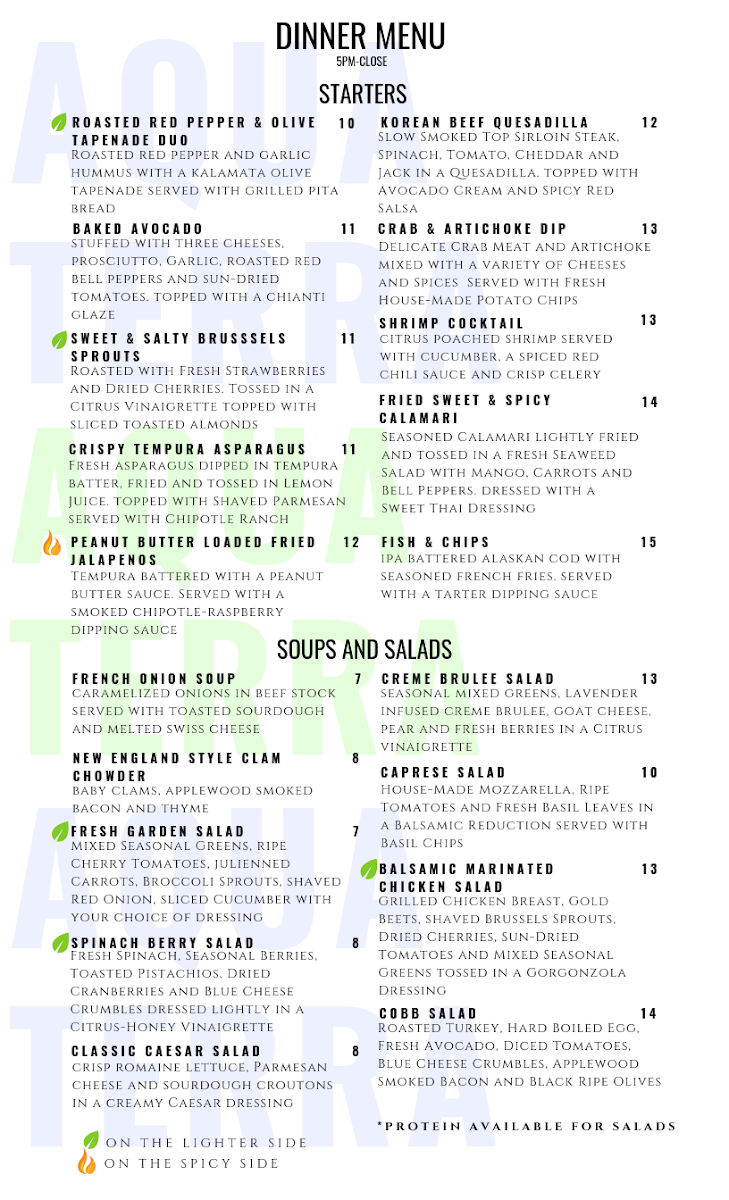 Whether you're stopping by for a casual meal or a special occasion, Aquaterra Restaurant offers a wide array of flavorful dishes, complemented by a great selection of drinks and a cozy ambiance that makes for a memorable dining experience.
