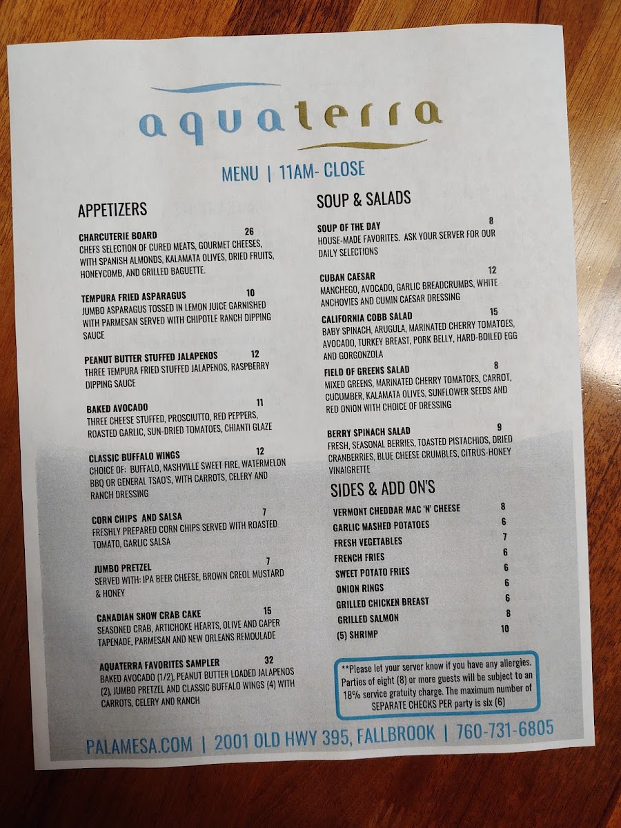 Aquaterra Restaurant at Pala Mesa Resort offers a diverse and delicious menu that caters to a variety of tastes and preferences. For those looking to start their meal with something light and flavorful, the Charcuterie Board and Tempura Fried Asparagus are perfect options. The Peanut Butter Stuffed Jalapenos and Baked Avocado provide a unique twist on traditional appetizers. If you're in the mood for something spicy, the Classic Buffalo Wings never disappoint.